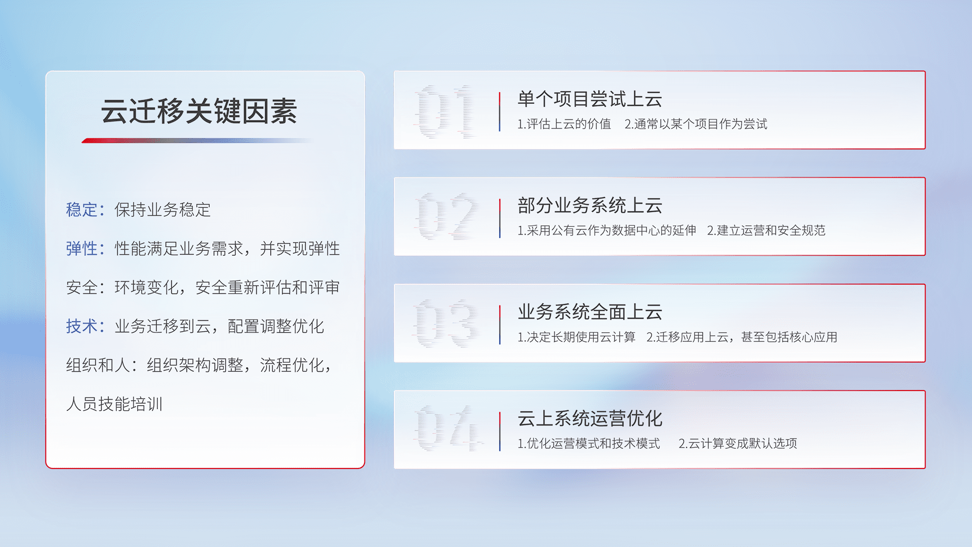 结合实际业务,,,从规划设计、、云平台选型、、云原生改造、、、、数据迁移、、、、集成交付,,,迁移全过程为客户识别最佳上云路径,,,做好风险识别管理,,,设计网络架构、、、、身份权限、、、、安全审计合规、、操作审计、、日志审计、、、、监控告警策略、、、、多站点容灾设计等,,对云上基础设施进行整体规划,,提升IT治理水平,,以满足弹性、、、高可用、、高性能的需求。。。
