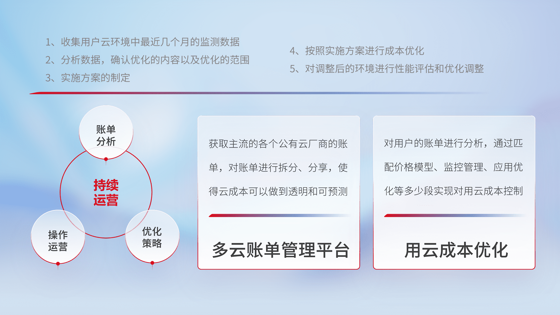 通过多云纳管,,,,以统一的资源数据模型把客户的云资源进行抽象和封装,,,进而实现对多云资源的统一操作,,,保障云资源管理的可靠性、、、稳定性与可用性。。。。量身定制化运维内容,,,,配置、、、、开发运维、、、补丁管理、、、、备份、、监控、、认证和访问管理、、、审计和日常巡检等,,保障在用云过程中的可靠度,,,,稳定度以及高可用率。。。。