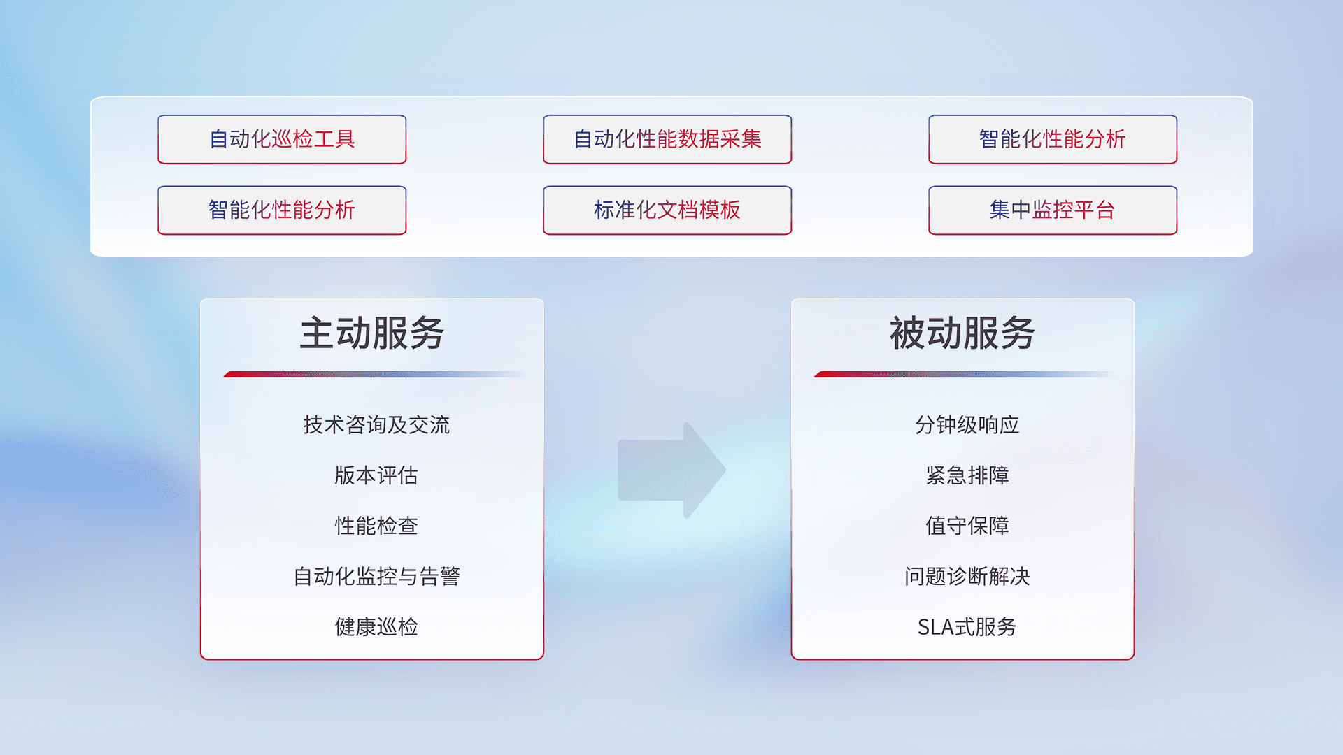 智能化工具和标准化文档,,,保障服务质量,,提供主动服务(包含技术咨询、、、、版本评估、、性能检查、、、自动化监控与告警、、、、健康巡检)和被动服务包含(分钟级响应、、紧急排障、、值守保障、、、、问题诊断解决、、、SLA服务)。。。