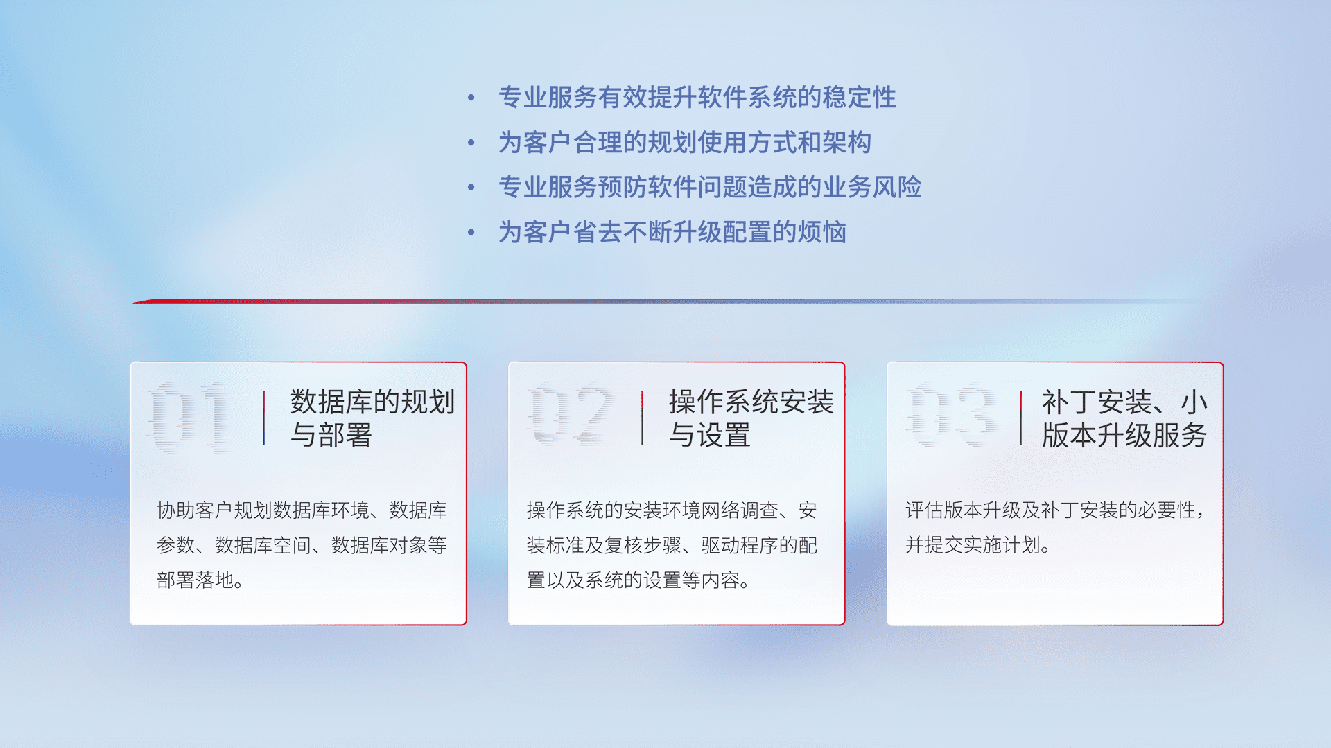 为客户提供软件规模升级、、、快速部署、、、、按需配置的专业服务,,从数据库的规划与部署到操作系统的安装与设置,,,,再到补丁安装和小版本升级提供支持。。。。