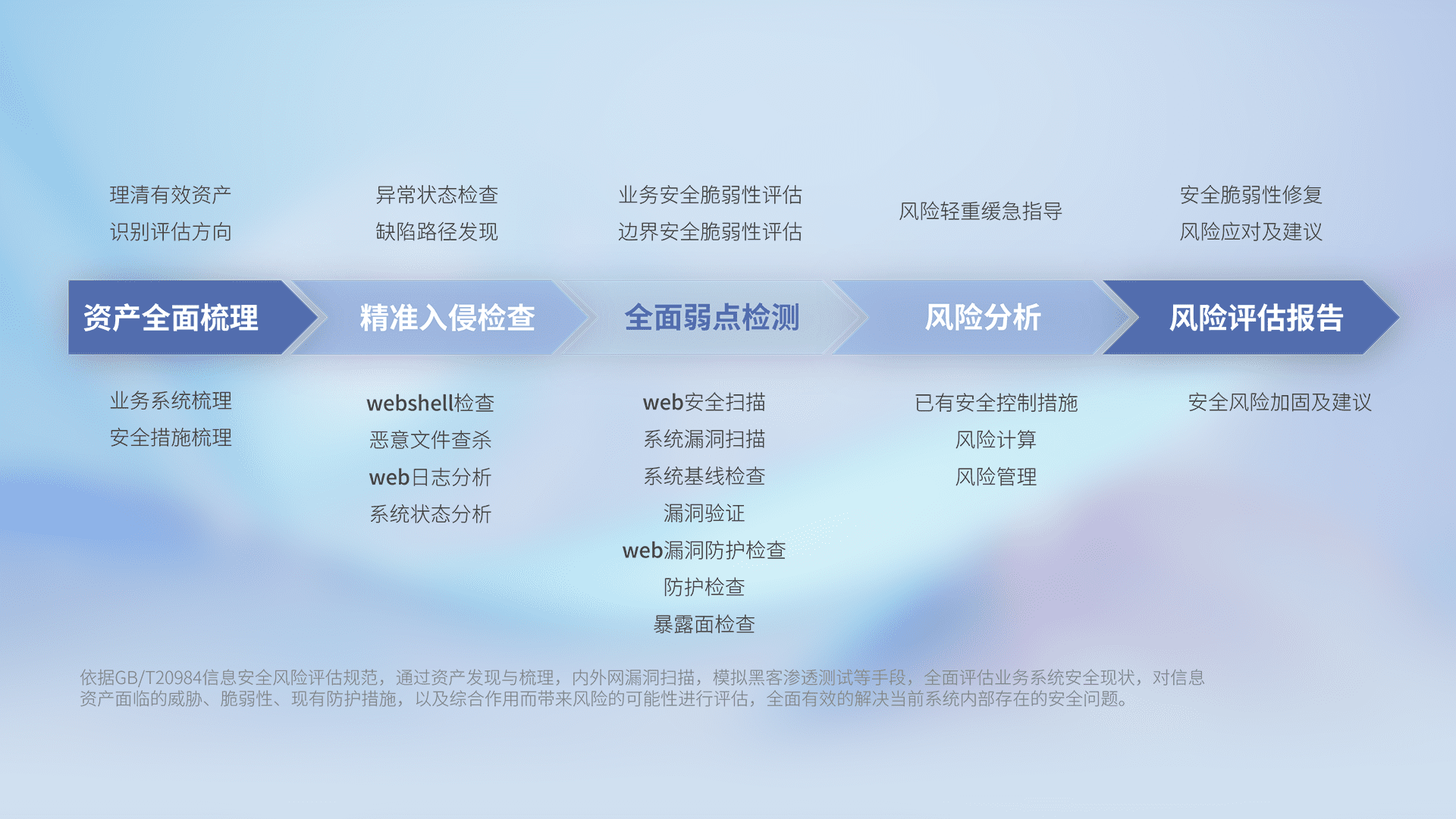 针对客户行业特性,,,,以专业的安全服务+多厂商联合解决方案提供专属的一站式安全管理服务,,帮助客户全面感知网络空间威胁,,,基于识别、、、、检测、、、、分析、、、防护、、监测、、、响应的服务理论模型,,从方案咨询、、集成交付、、、评估验证、、、优化加固、、、、运维运营,,致力于为客户提供完整的闭环管理式安全服务。。。以实战经验为客户打造高抵御风险的安全体系,,帮助客户发现威胁、、、对抗威胁、、、、处置威胁,,,,不断积累安全对抗能力,,,,持续保障数字化安全。。。。